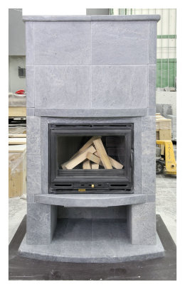 Облицовка из талькомагнезита толщиной 50 мм. Закладные металлические полосы для сборки облицовки камина. Металлические решетки для теплоподачи.
