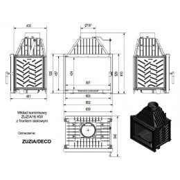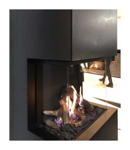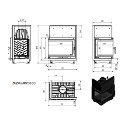 Данная облицовка имеет угловое расположение.Тыльная часть прикрыта листом черной стали. Крайние плитки слева и справа от топки имеют отверстия для конвекции воздуха (каналы проветривания). Дымоход подключается сверху.